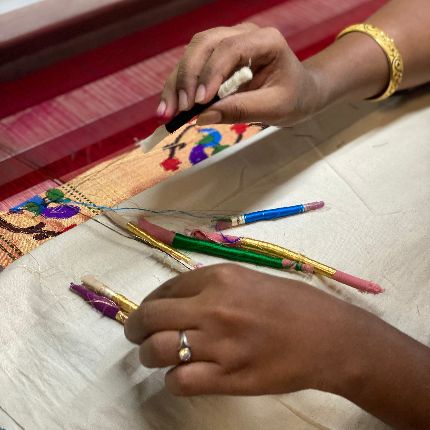 In an era of technological advancements, we remain committed to supporting and promoting the craftsmanship of our weavers. Their dedication and expertise is at the heart of every sari we create.